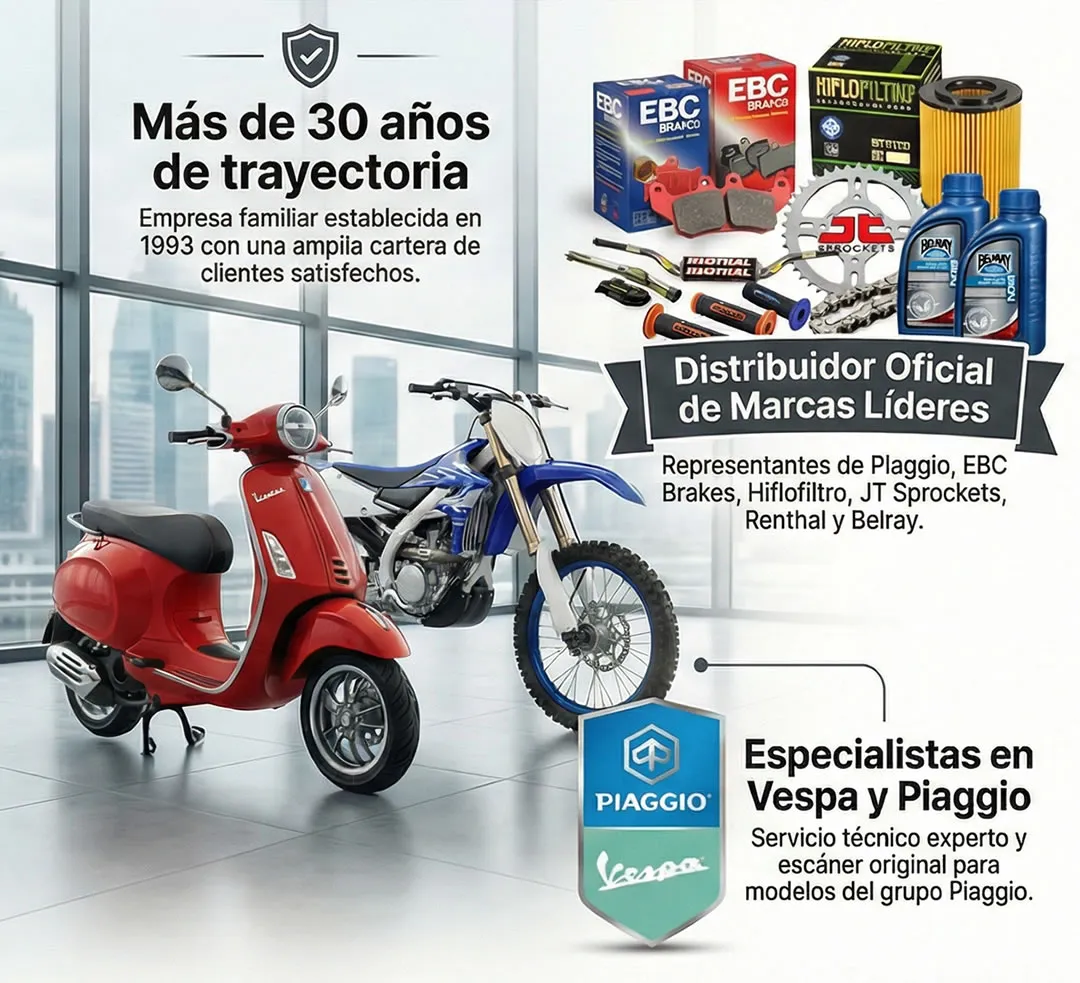 Distribuidores oficiales de Piaggio, EBC, Hiflofiltro y más. Calidad y experiencia desde 1993.